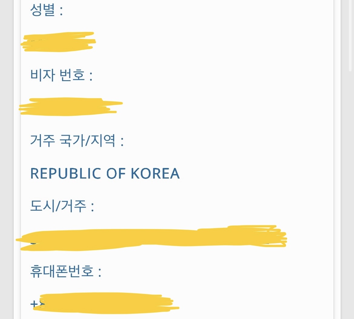 - 영문 이름, 성별, 생년월일, 본인 거주 지역 등